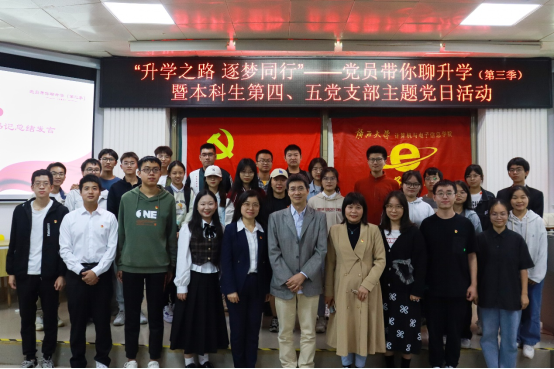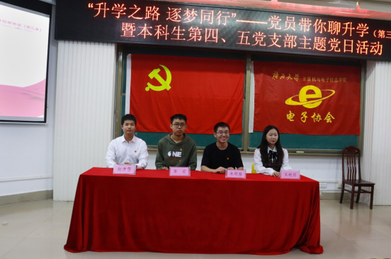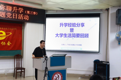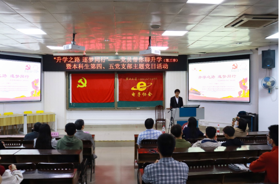 2022年11月26日晚上,由英国365上市公司本科生第四党支部主办,联合本科生第五党支部、学院团委电子创新协会共同承办的主题为“升学之路 逐梦同行”——党员带你聊升学(第三季)升学经验分享会在学院214报告厅举行。学院党委副书记邓珍琪老师,学院学生电子创新协会指导老师、电子信息工程系主任张学军教授,本科生第四党支部书记、学院团委副书记杨洋老师,本科生第五党支部书记、学院专职组织员薛金凤老师,学院专职辅导员庞承业老师出席会议。本次升学经验分享会由学院电子创新协会2021级本科生蔡其峰同学主持,通信工程191班朱硕隆同志、通信工程182班吴艳丽同志、网络工程192班姜岩同志、通信工程171班赵彦雪同志为本次分享会主讲人。