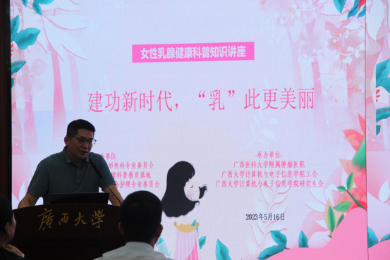 然后,广西医科大学附属肿瘤医院乳腺外科姬逸男副主任为大家做了《重塑“乳”初 逐梦未来——关于乳腺癌治疗的那些事儿》的主题报告。她在报告中指出,现在女性乳腺癌发病率相当高,女性应该做好定期检查。同时,姬副主任通过数据和图片对比,向大家展示了乳腺切除术后的效果,并介绍了乳房再造术的应用和治疗范围,以及进行肿瘤治疗后的复查和随访措施。