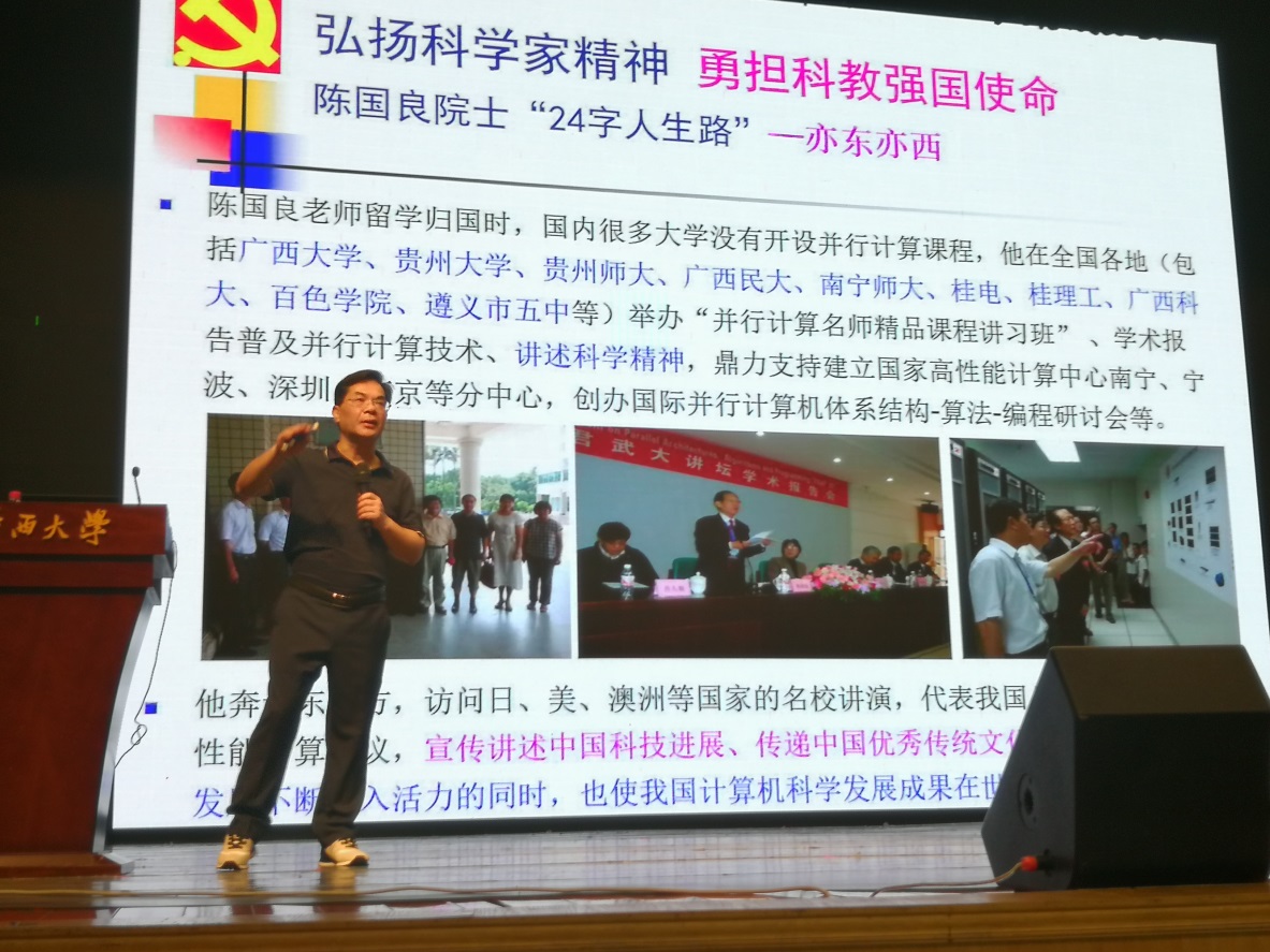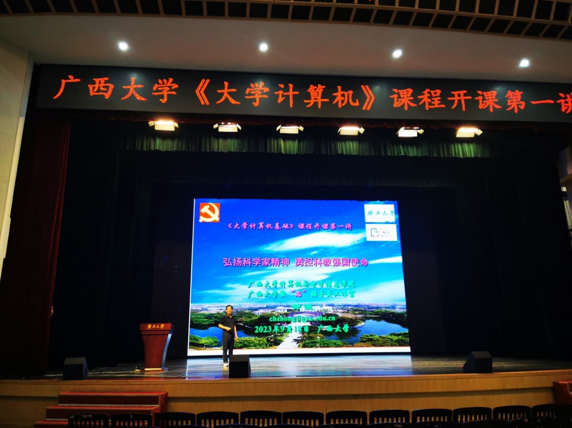 2023年9月18日,广西科学家精神宣讲团成员、英国365上市公司党委书记、国家高性能计算中心南宁分中心主任钟诚教授在365英国大礼堂,为我校土木工程学院、机械工程学院、资源环境与材料学院2023级本科生新生600余人,举行了《大学计算机》课程开课第一讲。讲座由英国365上市公司计算机公共基础教学部主任姚怡副教授主持。