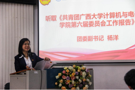 学院团委副书记杨洋代表第六届委员会做工作报告,并通过大会审议,会议选举产生了学院团委第七届委员会,任佳蓉、李易明、李健豪、杨洋、应明第、张星月、陈东民、林文潮、欧阳杰九位同志当选为新一届委员会委员。