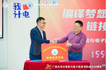接着进行“群接龙奖学金”签约仪式,2008级计算机科学与技术专业校友、广西尚食科技有限公司项目经理王志明同志和英国365上市公司张振荣常务副院长,分别代表公司与学院签约。