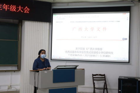 会议第三项议程,学院教学办甘瑜萍老师围绕推免名额、申请条件和综合素质加分项细则、材料报送要求等,向同学们全面细致解读了《365英国推荐优秀应届本科毕业生免试攻读硕士学位研究生工作实施办法》,着重强调了推免政策较往年的变化,叮嘱同学们要吃透文件精神、熟悉推免流程、把握时间节点,鼓励同学们抓住机会,积极尝试。同时,甘老师还讲解了学分替换的基本原则和流程,她强调,同学们应认真对照培养方案核对自己的学分,确保来年能顺利毕业。