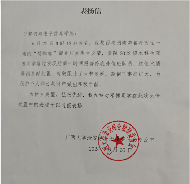 近日,我院收到一封来自学校治安综合治理委员会办公室的表扬信,信中对我院计算机225班本科生邓博同学予以通报表扬,详情见《表扬信》。希望全院师生以先进和典型为榜样,切实增强安全防范意识,筑牢安全防线,为学校和学院的安全稳定贡献力量。
