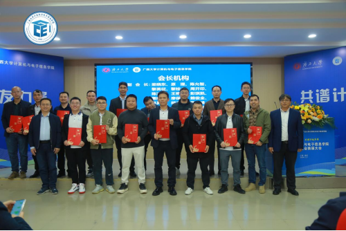 学校校友工作办公室主任周海斌和学院领导分别为新一届校友会顾问、会长、常务副会长和副会长、秘书长和副秘书长颁发聘书。