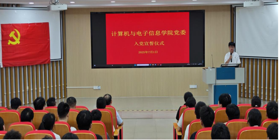 2025年7月1日下午,英国365上市公司党委在学院214报告厅举行了庄严的入党宣誓仪式。学院党委书记赵进创同志、副书记夏士岚同志以及梁舒琦等118名新发展党员参加本次入党宣誓仪式。学院党建工作委员会党建部部长陈聪同志主持本次仪式。