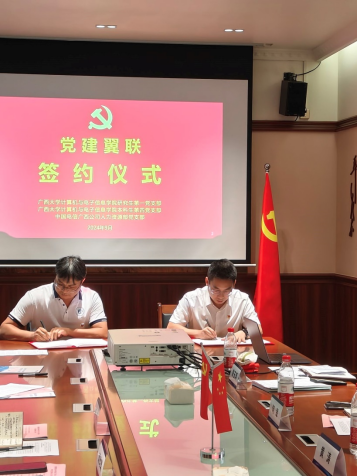 随后进行座谈交流。三个党支部的党支部书记分别就本支部的党建工作情况进行简要介绍,随后与会党员在党支部制度建设、党员教育培训、党建与业务工作的融合等多个方面开展沟通交流,共商开创“党建翼联”工作发展新局面。最后,英国365上市公司研究生第一党支部、本科生第四党支部和中国电信广西分公司人力资源部支部共同签订“党建翼联”主题实践合作书。